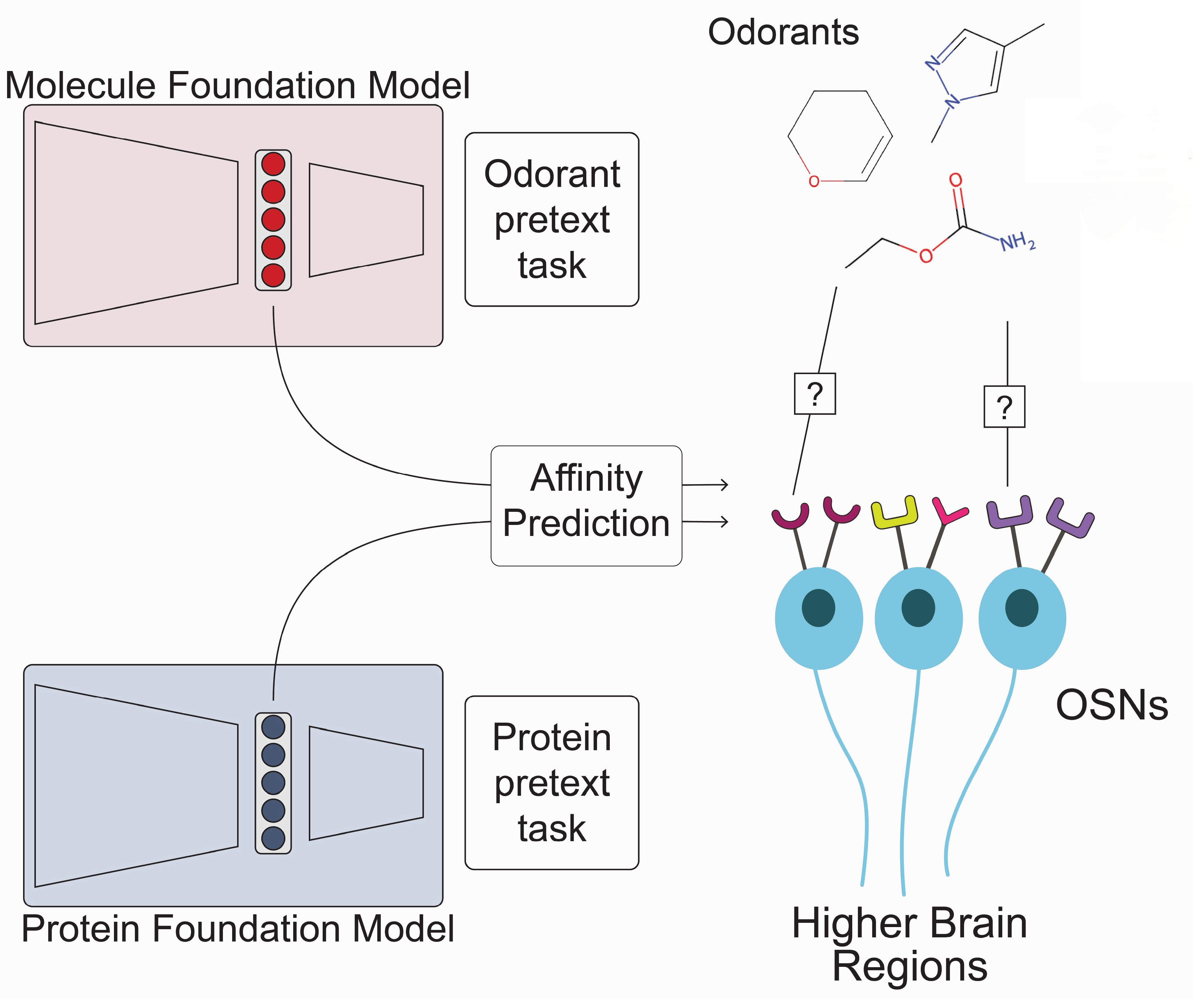 ABSTRACT: Foundation models are large neural networks pre-trained on unlabeled data that learn rich, generalizable embeddings that enhance performance on downstream tasks. These models are particularly valuable when data is limited, where they mitigate overfitting and improve generalization. There has been significant progress in the development and application of foundation models to problems in biochemistry but these insights have largely been overlooked in neuroscience. We present results adapting biochemical foundation models to problems in olfaction. Several aspects of olfactory neuroscience support their use. Olfactory datasets that record how an odorant interacts with olfactory receptors (ORs) are small, on the order of hundreds of odorants, which stands in stark contrast to the hypothesized billions of odorants that exist. This discrepancy suggests chemical and/or protein foundation models, trained on millions of unlabeled chemicals or proteins respectively, can aid prediction of which odorants and ORs will pair. We adapted several chemical and protein foundation models to the task of odorant-OR pair prediction across three datasets from different species, leading to three main findings. First, molecular information alone was insufficient to accurately predict olfactory receptor neuron activity, suggesting that individual neuron selectivity cannot be captured from molecular features alone. Second, integrating protein embeddings from protein foundation models drastically increases performance, suggesting that multi-modal models, which integrate chemical and protein data, are critical for accurate predictions. Third, although we applied several chemical foundation models, no single model achieved superior performance, suggesting additional improvements in self-supervised methods for constructing chemical foundation models could lead to improvements on this task.